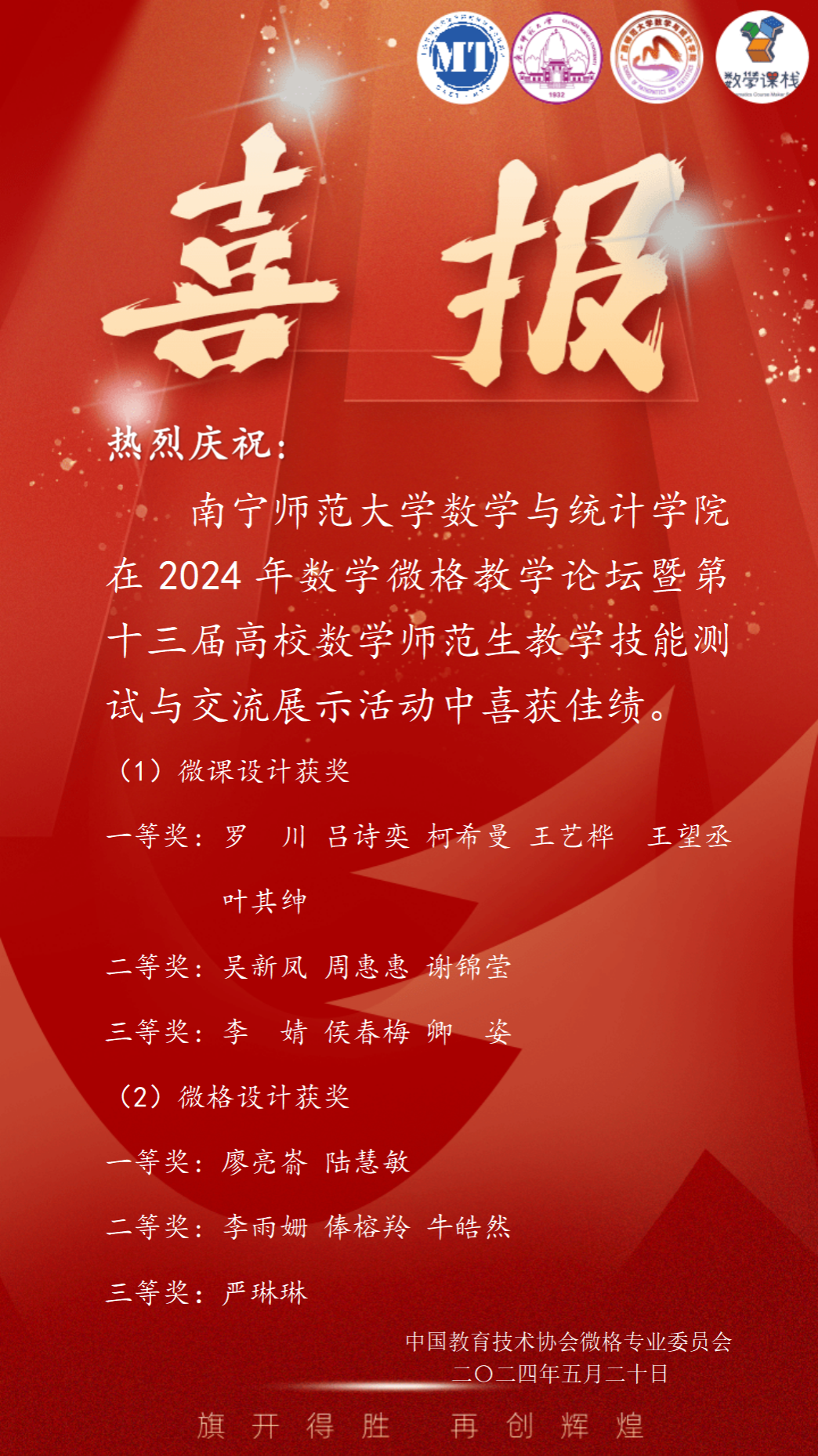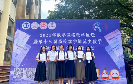 为加强师范生的教学技能训练,培养师范生的教学创新能力,提升数学师范生信息技术深度融合数学教学的能力和综合教学技能,促进教师教育发展,2024年数学微格教学论坛暨第十三届高校数学师范生教学技能测试与交流展示活动于2024年5月17日至20日在广西师范大学顺利举办。公司学子在比赛中表现优异,参赛作品及选手全部获奖。其中,6名参加微格教学测试的选手分别获得2个一等,3个二等,1个三等;4个参加数学微课比赛的作品分别获得一等2项,二等1项,三等1项。