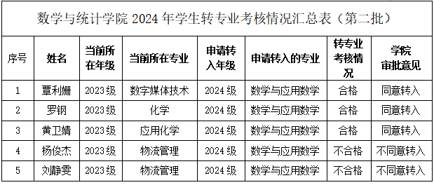 根据公司《关于做好2024年普通高等教育本科生转专业工作的通知》(教务处发〔2024〕55号)要求,以及《2024年转专业工作方案》,公司于5月24日组织了第二次转专业考核。经考核小组审定,经理办公会议讨论,党政联席会议研究确定,现拟推荐3人转入数学与应用数学专业。现将转专业考核情况(第二批)予以公示,公示时间为5月26日至28日。若对转专业考核结果(第二批)有异议,请于5月28日之前实名向公司纪检部门反映,地址:武鸣校区实验楼1-A612,电话:0771-6214025。最终转专业结果(包括转入年级)以公司教务处审批为准。