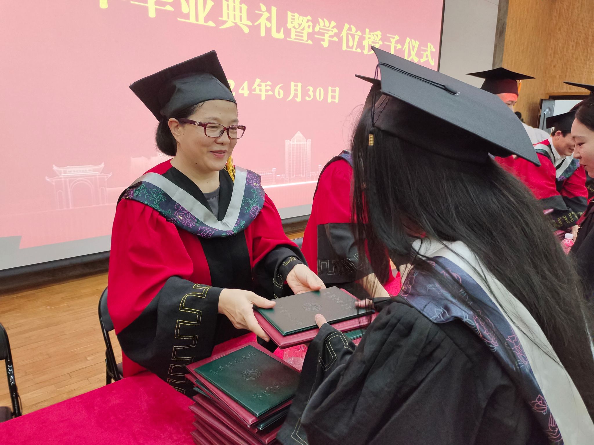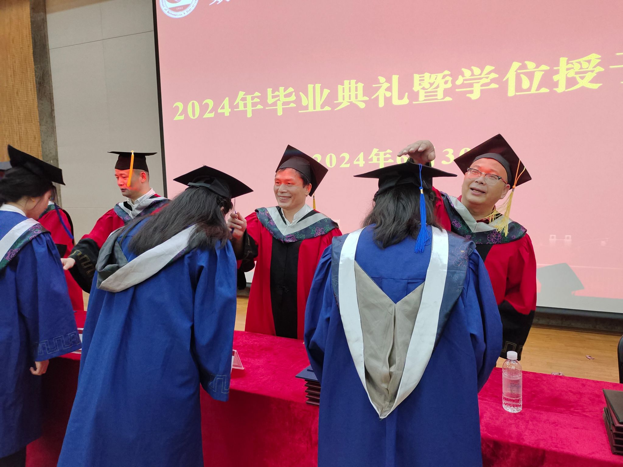 随后,该院领导老师们为2024届全体毕业生拨穗正冠并颁发毕业生毕业证书、学位证书。场面庄重而温馨。