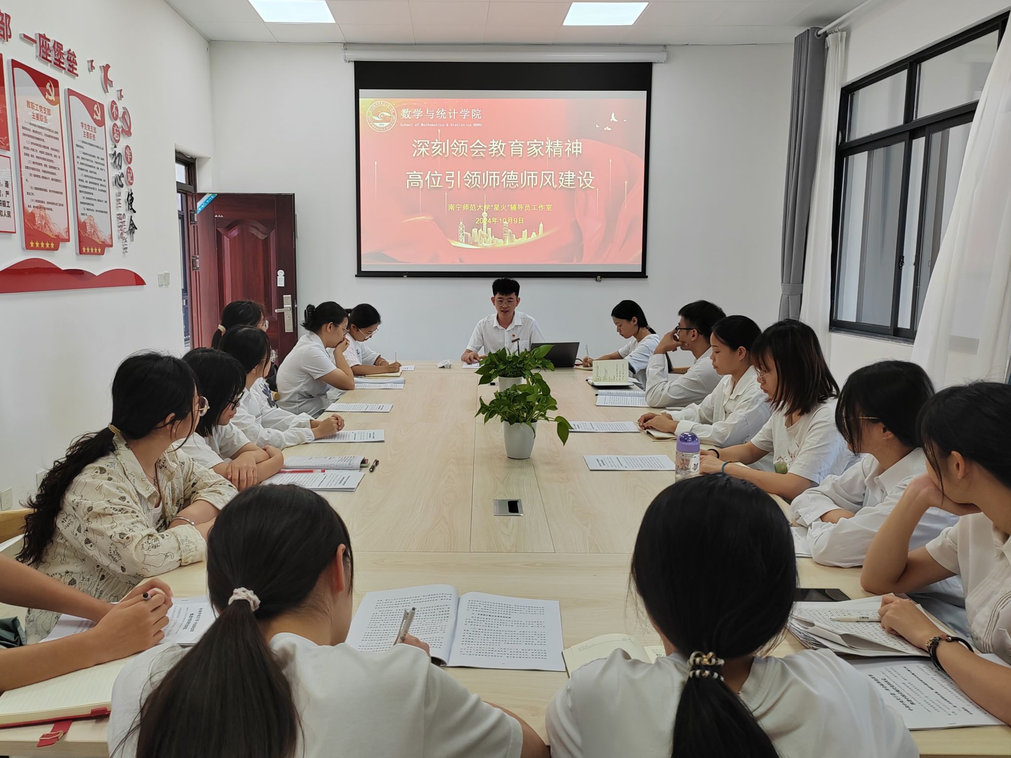 为深入学习贯彻全国教育大会精神,大力弘扬教育家精神。williamhill于10月9日下午在武鸣校区兰园党员活动室召开“弘扬教育家精神”主题党课。本科生第二、三党支部参与此次党课,本次党课由辅导员第生辉老师主讲。