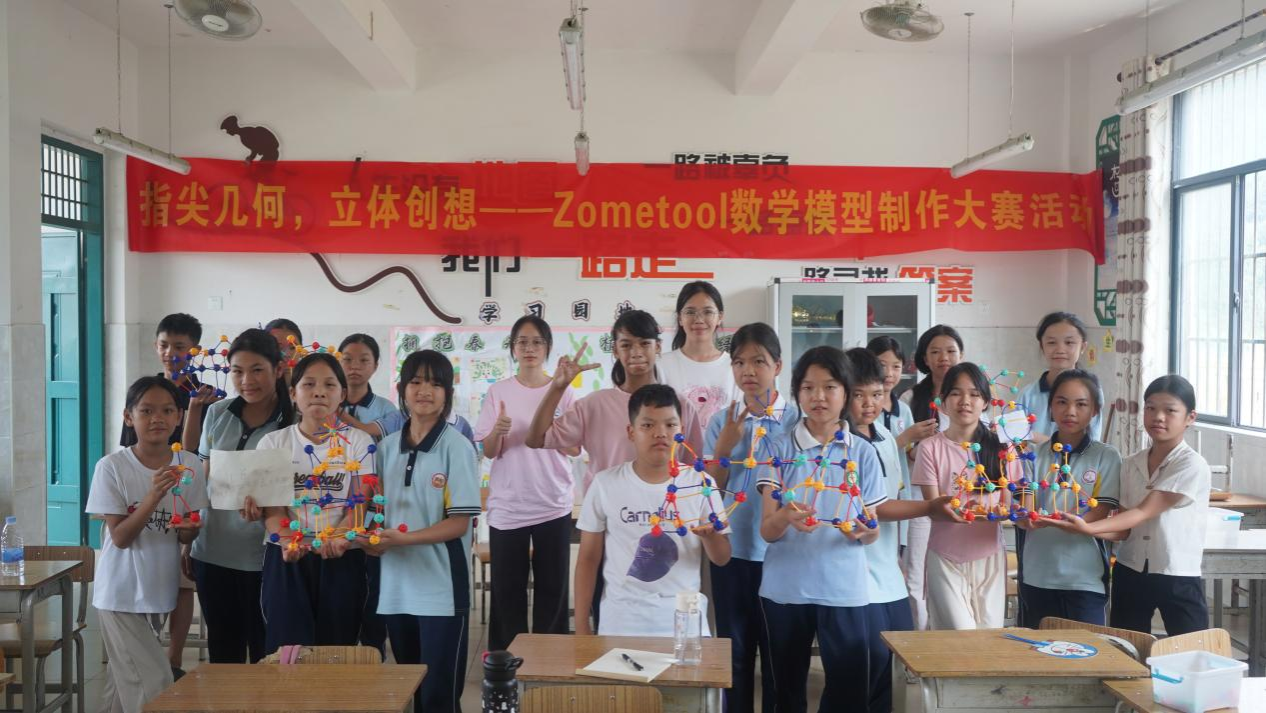 实践服务队支教组队员在老师的指导下以“数学+”为特色制定了七彩课堂教学计划:在第一节课上以破冰游戏拉开序幕“逢7过”“数字炸弹”“数学版狼人杀”等趣味互动破冰,小员工们在欢笑中迅速熟络;人形摆π字比赛中,各班同学化身“移动的笔画”,听令调整站位,用身影在操场勾勒出π的轮廓,从模糊到清晰,从杂乱到整齐,团结协作让抽象的数学符号变得鲜活,悄然点燃探索热情;数学模型搭建现场创意迸发,小员工们以小组为单位,将想象转化为立体建筑。Zometool几何模型套件在他们的巧手下变成各式造型,动手过程中,空间思维与团队默契同步提升;“水火箭”科学实验活动中通过老师示范,再让员工尝试用生动实践点燃乡村小员工们的科学好奇心。这些活动丰富了孩子们的课余生活,更让他们在学与玩中收获知识、展现自我,实现全面成长。