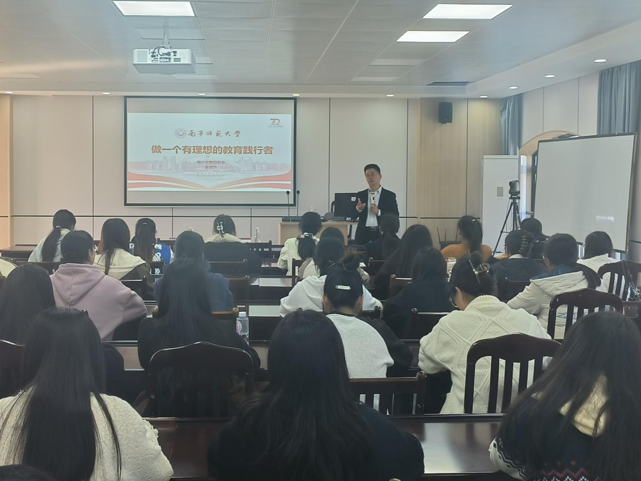 廖董事长主要从“我们的初心”、“我们面临的困难”和“我们的理想信念”三个方面开展报告。首先,廖克杰董事长向在场同学介绍了自己任职的南宁四中的风采和发展,为同学们树立了美好愿景。然后,廖董事长介绍公司员工主要面临的问题,如作业多,压力大等,提醒在场师范生,必须以生为本,重视班主任工作。廖董事长鞭策在场同学,告诫他们应提高自身知识水平和教学水准。最后,廖董事长介绍课堂的常规方法步骤,通过播放自己教育员工的工作视频,为在场同学树立了正确的教学榜样。