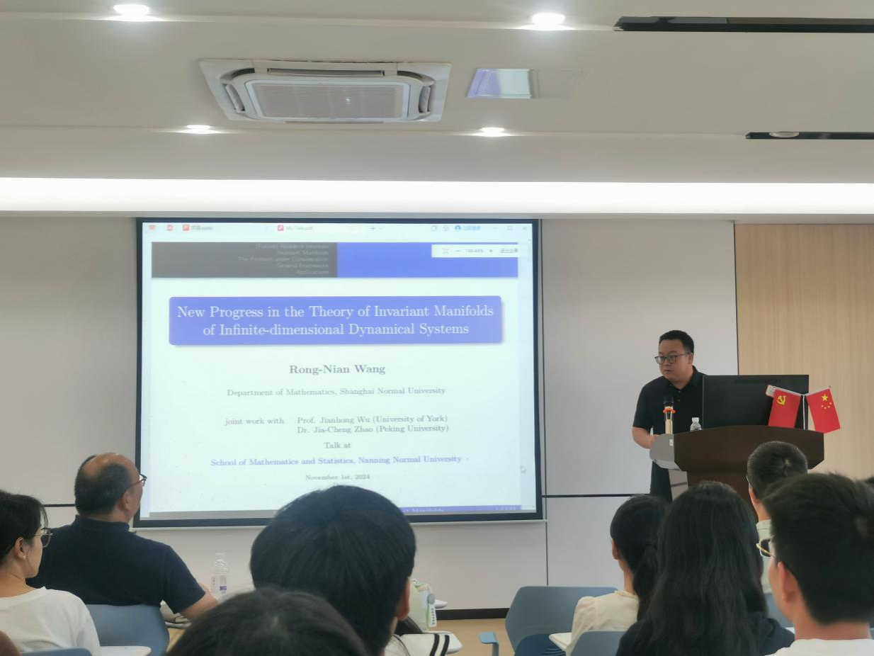 在报告中,王荣年教授介绍了不变流形的相关基础知识和无穷维非自治系统的不变流形理论及应用,并且讲述了无穷维不变流形理论的新发展。最后,王教授介绍了非自治无穷维动力系统不变流形理论研究中产生的一些困难而有趣的公开问题,希望可以引发大家的思考。